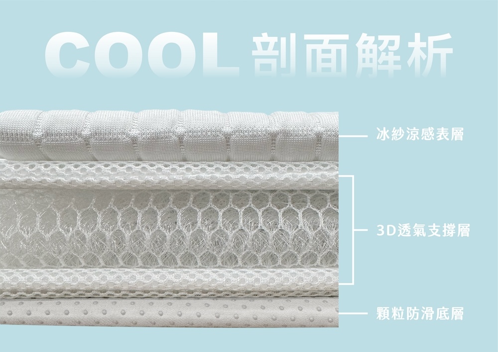 3D立體空氣層 有效的使空氣、水氣流通,形成循環空氣層,營造乾爽舒適的睡眠環境