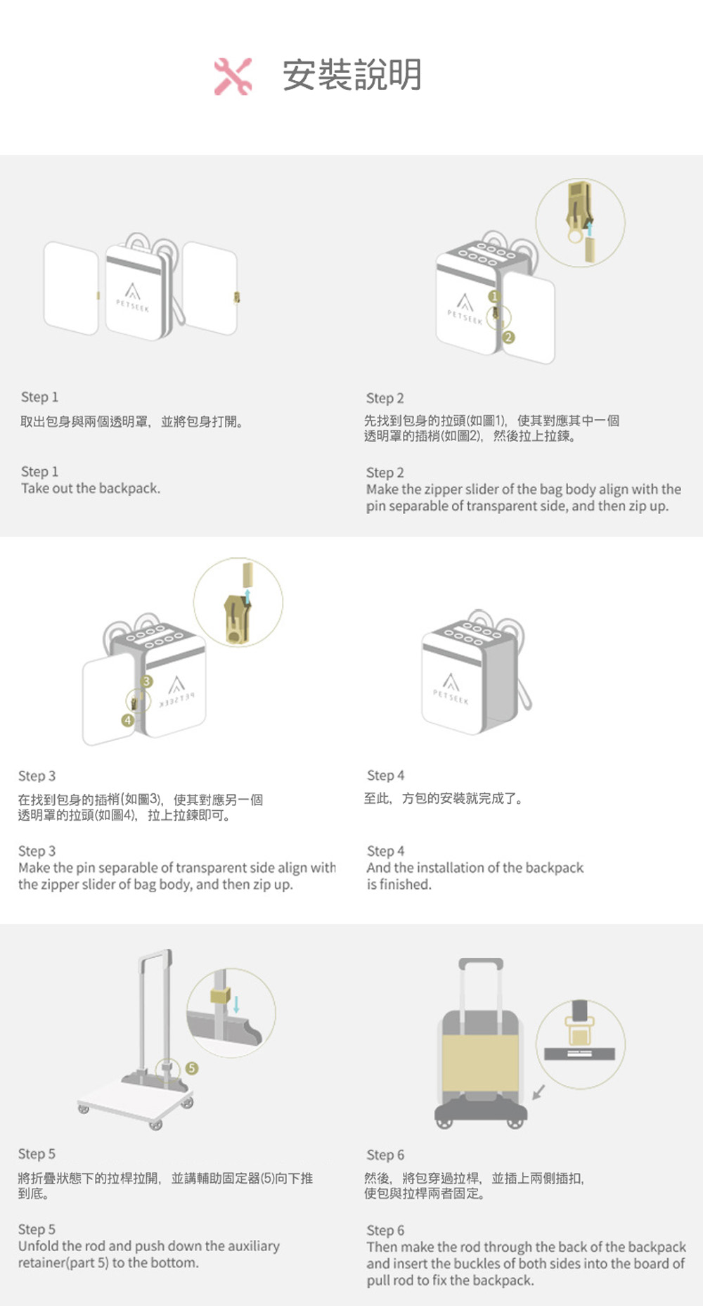 材質 : 聚脂纖維、EVA、PET(透明板)、全鋁(拉桿)