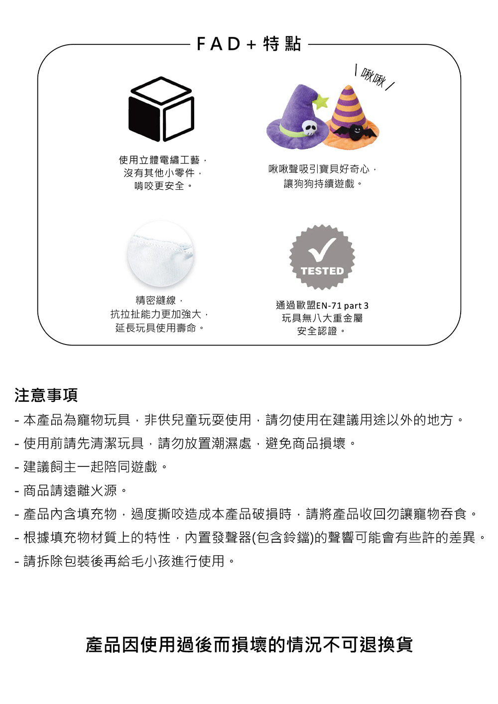 產品內含填充物,過度撕咬造成本產品破損時,請將產品收回勿讓寵物吞食。