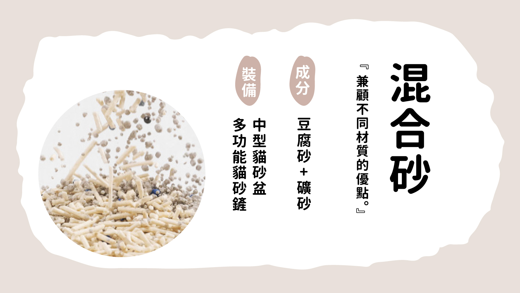 - 結合不同材質的優點,例如結塊效果和吸水性