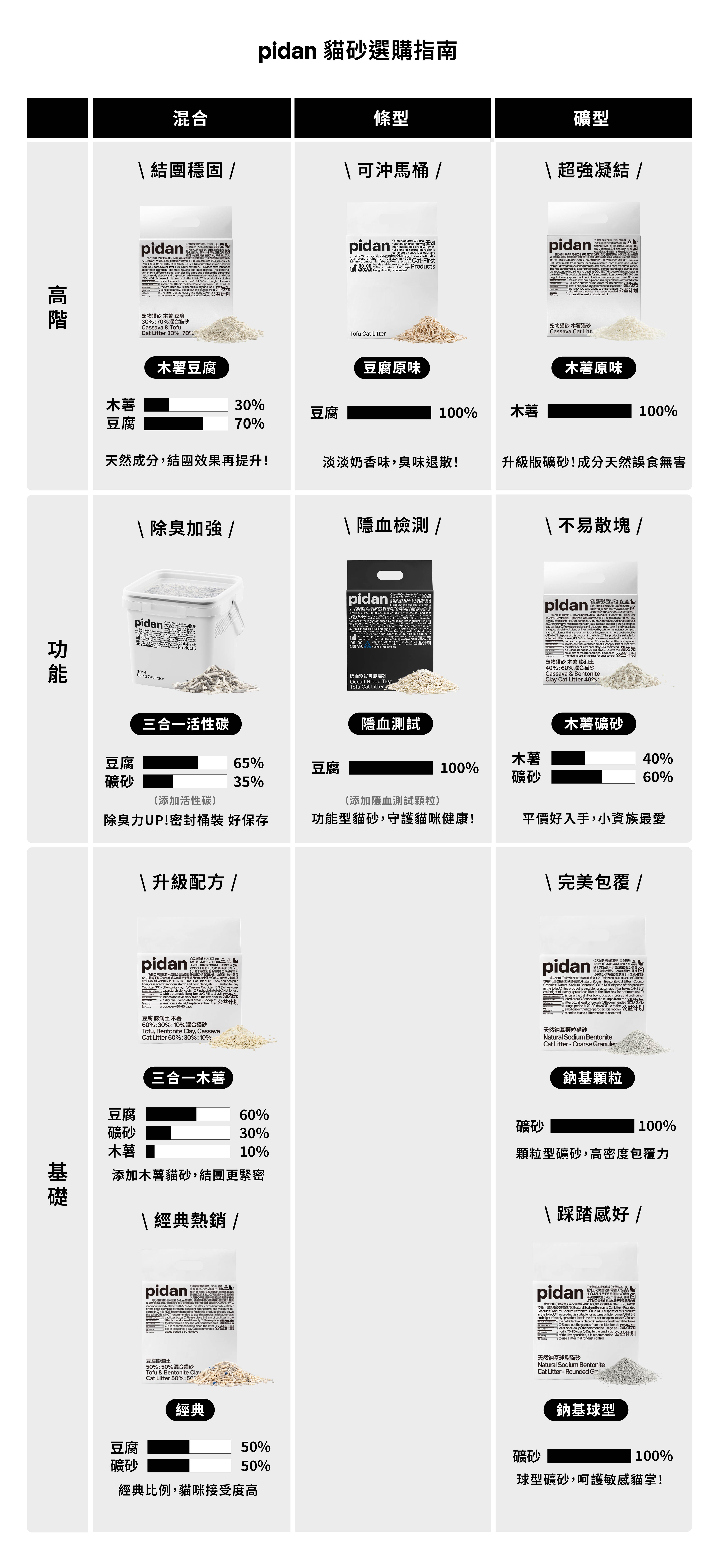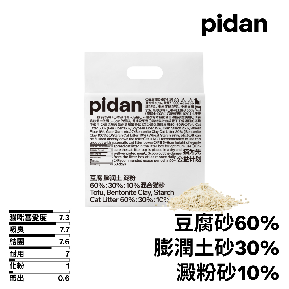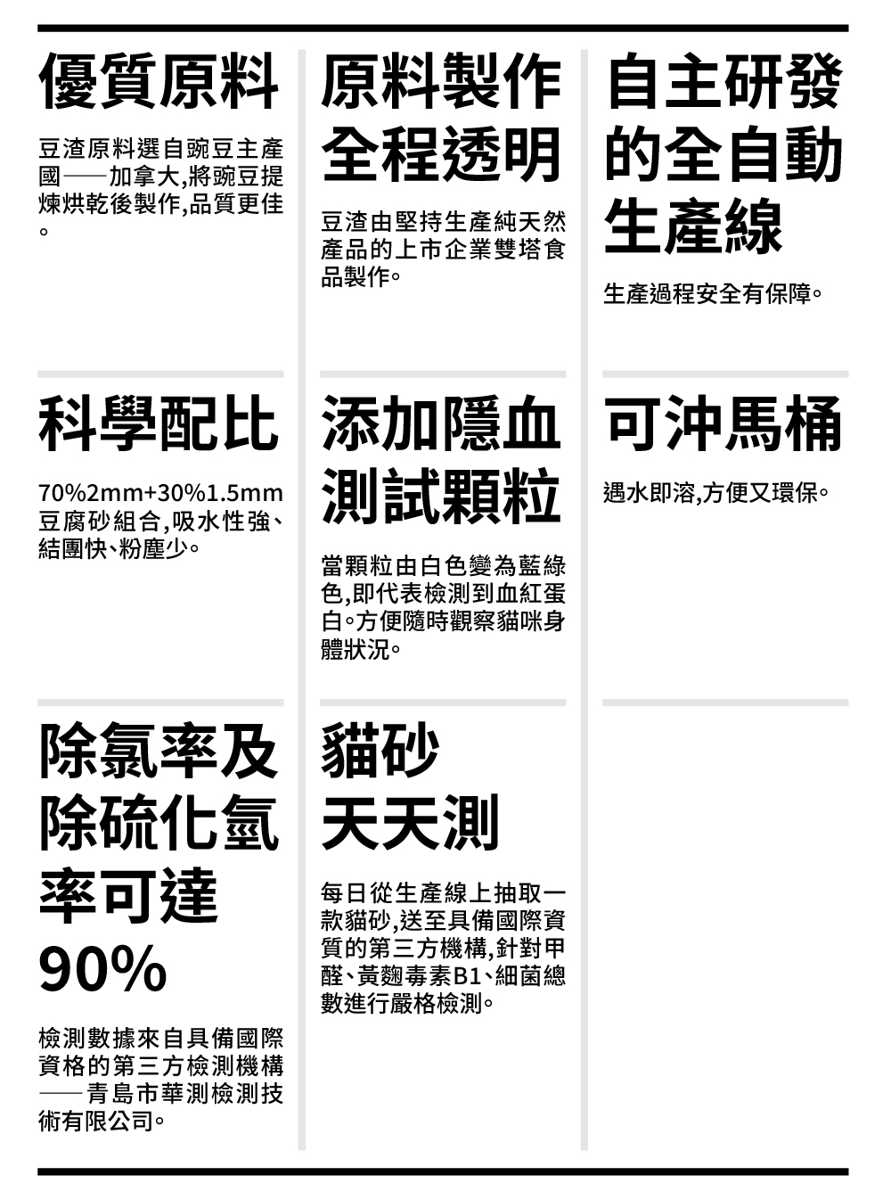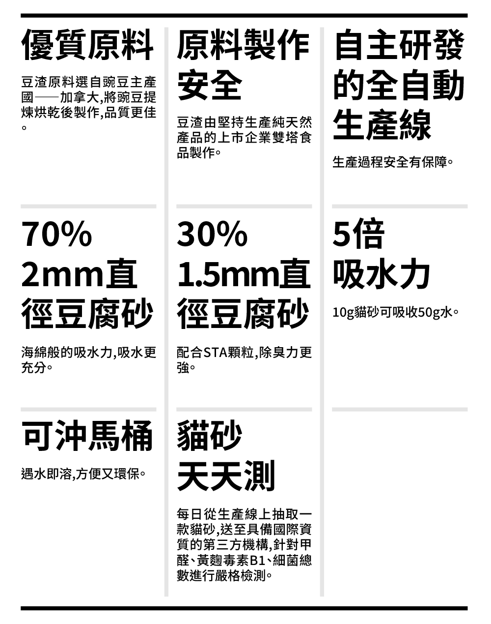 ● 60%豆腐貓砂+30%澎潤土貓砂+10%澱粉貓砂的升級全新配比