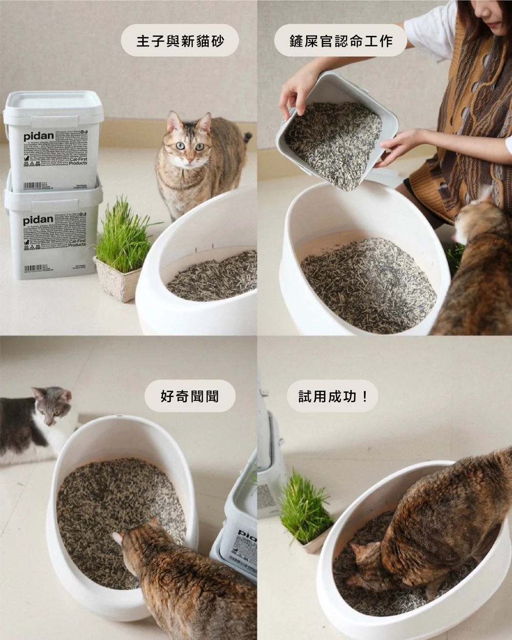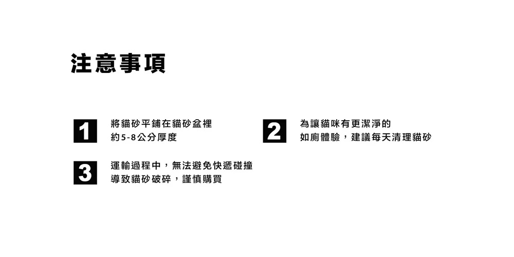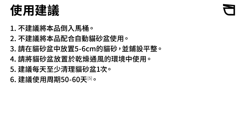 將貓砂平鋪在貓砂盆裡3-5厘米的厚度,為讓貓咪擁有更清潔的如廁體驗,建議每天清理貓貓砂