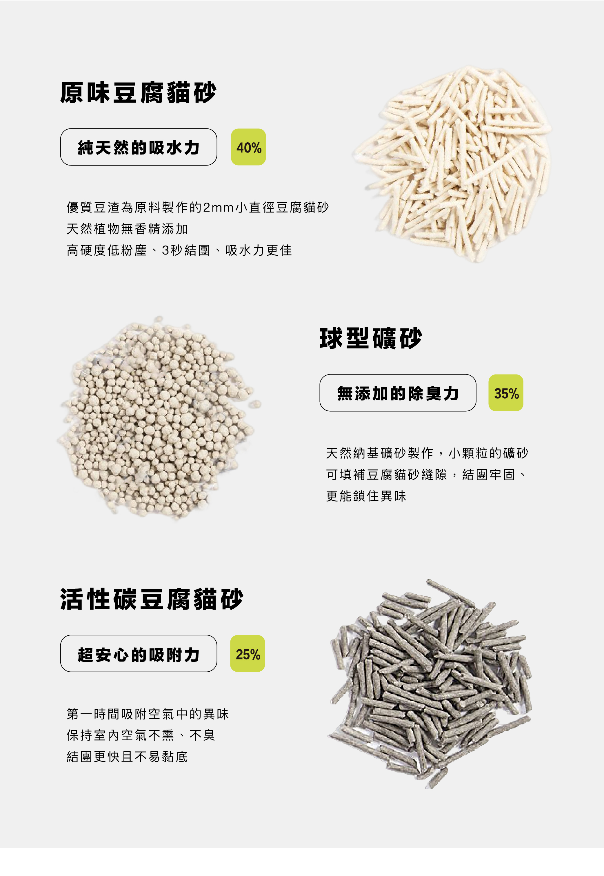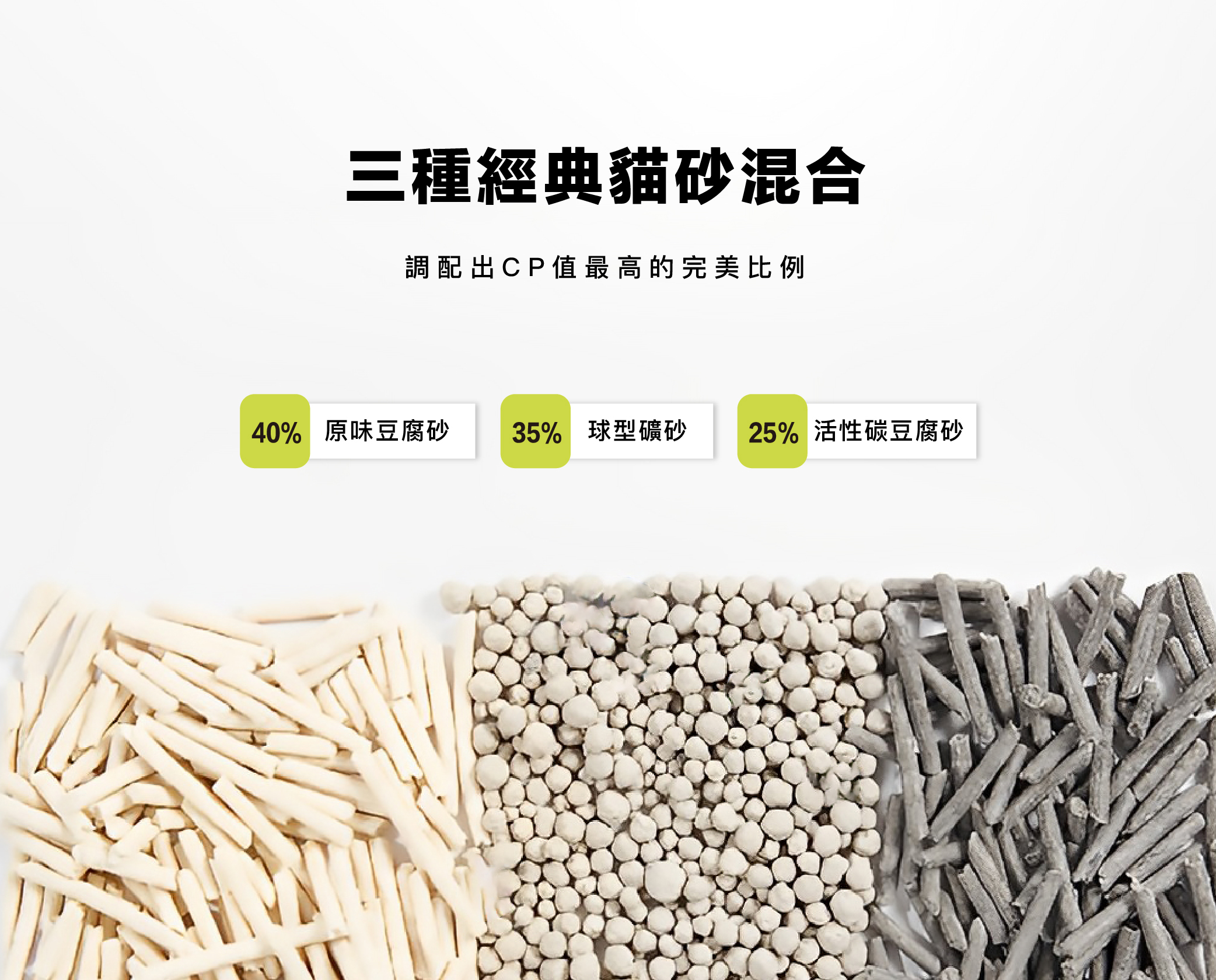 ● 40%原味豆腐砂 + 35%球形礦砂 + 25%活性碳豆腐砂